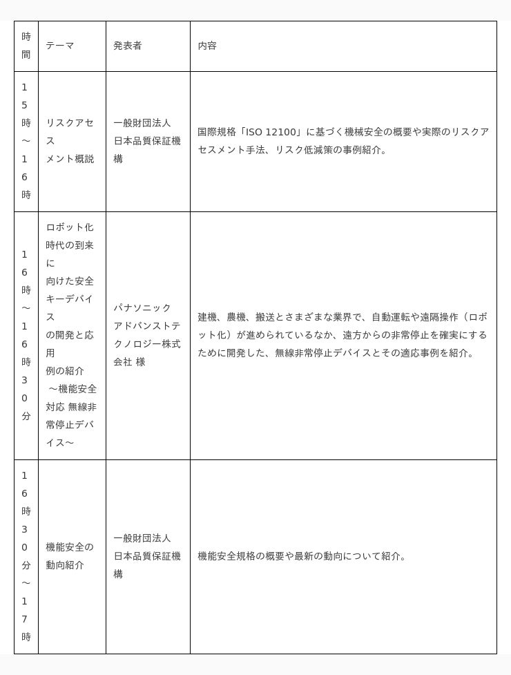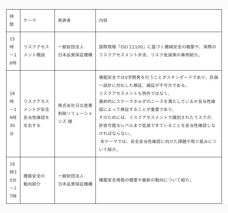 また、「機能安全」セミナーでは、機能安全規格の概要や最新の動向をご紹介するとともに、機能安全に関する取り組みをされている企業の方々をゲストとしてお招きし、リスクアセスメントや機能安全をテーマに各事例を発表いただく予定です。