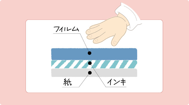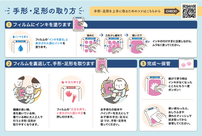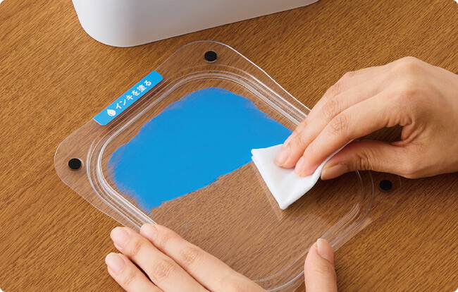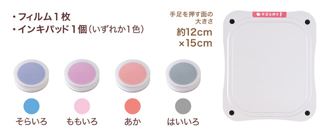 付属のインキパッドを使いフィルムにインキを塗り、その反対面から手足を押すことで、直接インキに触れずに紙に手形・足形を転写できます。