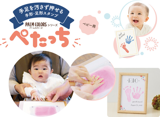 「ぺたっち ベビー用」は、お子様の手足を汚すことなく手形・足形がとれる新感覚のキットです。インキを直接手足に付けるのではなく、インキが下に塗られたフィルムの上から手足を押すことで、インキに触れることなく紙に手形・足形を残せます。手や足にインキを付けないのでお子様やお部屋を汚す心配なく、思い出を彩る作品づくりを楽しむことができます。作品づくりはもちろん、お子様の成長を残すイベントとして、そのプロセスも楽しめます。