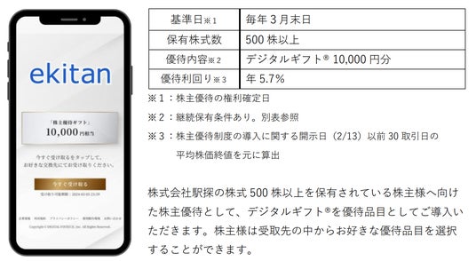 株式会社駅探(代表取締役社長:菊井 健大、東証グロース:証券コード 3646)において、株式会社デジタルプラス(代表取締役社長:菊池 誠晃、本社:東京都渋谷区、東証グロース市場:証券コード3691)グループが運営する「デジタルギフト(R)」を株主優待としてご活用いただくことになりました。