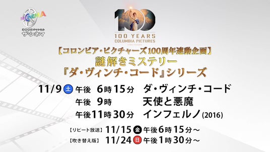 数々の名作を生み出し、アカデミー賞(R)作品賞最多受賞の、アメリカ5大スタジオのひとつ「コロンビア・ピクチャーズ」は、現在はソニー・ピクチャーズ エンタテインメントの傘下にあり、2024年1月に創立100周年を迎えました。11月は、社会現象を巻き起こした世界的ベストセラーミステリーを、原作ファンをうならせる映像の力で見事に映画化した大ヒットシリーズ『ダ・ヴィンチ・コード』シリーズ3作を連続放送します!