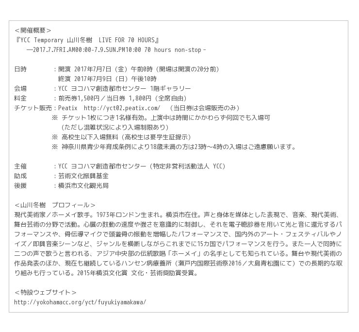 YCCでしか見ることのできない山川冬樹の「LIVE FOR 70 HOURS」を是非、ご高覧ください。