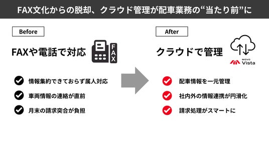 ーに根づくアナログな配車手配業務でした。FAXや電話による車両情報のやりとりに加え、月末の請求