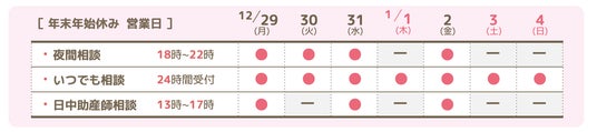 - 日中助産師相談 (月・水・金曜日 13時~17時):12/29(月)、12/31(水)、1/2(金)