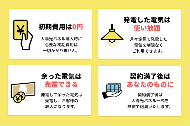 太陽光パネル導入時に必要な初期費用は一切かかりません。 導入時の工事費用や太陽光パネル等の機器も費用負担0で導入いただけます。