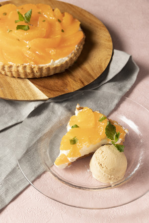 ヨーグルトとデコポンのゼスト(外果皮)を入れて香りをうつした軽やかなムースに、旬を迎えたジューシーなデコポンをたっぷり乗せました。自家製パイのサクッとした軽い食感がアクセントに。紅茶のアイスと一緒に召し上がりください。