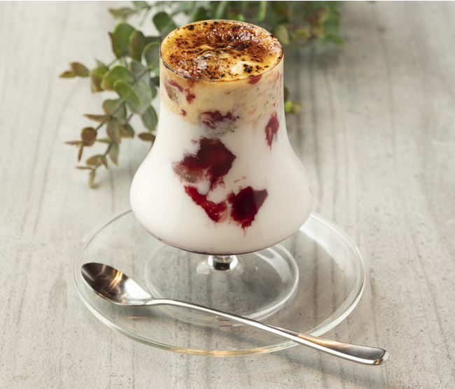 イチゴ・フランボワーズ・ラベンダーの自家製コンフィチュールが入った冷たいイチゴミルクの上に、クレームブリュレを乗せたとろーり食感のスイーツドリンク。