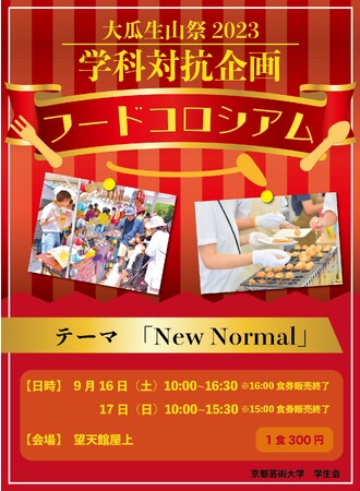 学校法人瓜生山学園 京都芸術大学(京都市左京区/学長 吉川左紀子)は、2023年9月16日(土)・17日(日)に「大瓜生山祭2023―come back」(学園祭)を開催し、その一環として4年ぶりに学科対抗屋台企画「フードコロシアム」を開催します。「New Normal」をテーマに、学科の個性が光る売り上げ対決をどうぞお楽しみください。