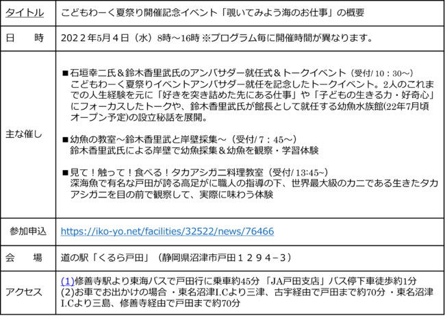また5月4日には「こどもわーく夏祭り」開催を祝した記念イベント「覗いてみよう海のお仕事」を静岡県沼津市 道の駅くるら戸田で開催。同イベントでは、石垣幸二氏と鈴木香里武氏のアンバサダー就任式、両氏によるトークイベントを実施。更に鈴木香里武氏による幼魚採集体験や戸田名物タカアシガニの調理体験など、ここでしかできない貴重なプログラムを実施予定です。