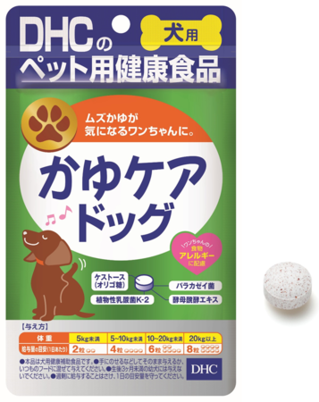 「DHC 犬用 かゆケアドッグ」は、腸内細菌叢を整えるオリゴ糖の一種であるケストース、バリアサポート成分の酵母醗酵エキス、植物性乳酸菌K-2・パラカゼイ菌のWの乳酸菌を配合し、ワンちゃんのムズかゆにアプローチするサプリメントです。