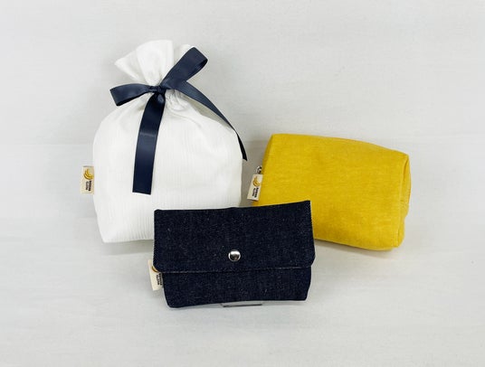 生地コーナーから奥に進むと、見えてくるのは梱包・資材の「形状コーナー」。ここでは、ポーチやエコバッグなどの定番資材に加え、巾着やあずま袋といった特徴的な形状の資材まで幅広く展示しています。とくに一部に透明素材を取り入れた中身が見える巾着やさまざまなものを自在に包める風呂敷など、実用性とデザインを兼ね備えた資材は必見です。グッズの形状や仕様にマンネリ化しがちな梱包・資材に新しいアイデアを取り入れたい化粧品企画担当者様に、訪れていただきたいブースです。