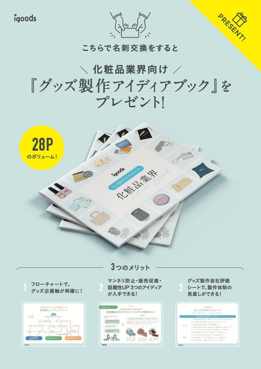 さらに、当日会場内にて名刺を交換していただいた方には、全28ページの化粧品業界向け『グッズ制作アイデアブック』をお渡しします。新しいグッズの企画方法や、制作期間やシーンに応じた展開ポイントをわかりやすく解説。読んですぐ自社の企画に活用できる内容となっています。