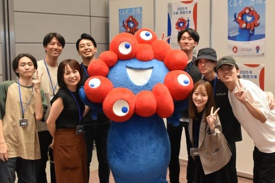 大阪・関西万博の公式キャラクター「ミャクミャク」くんとの記念写真