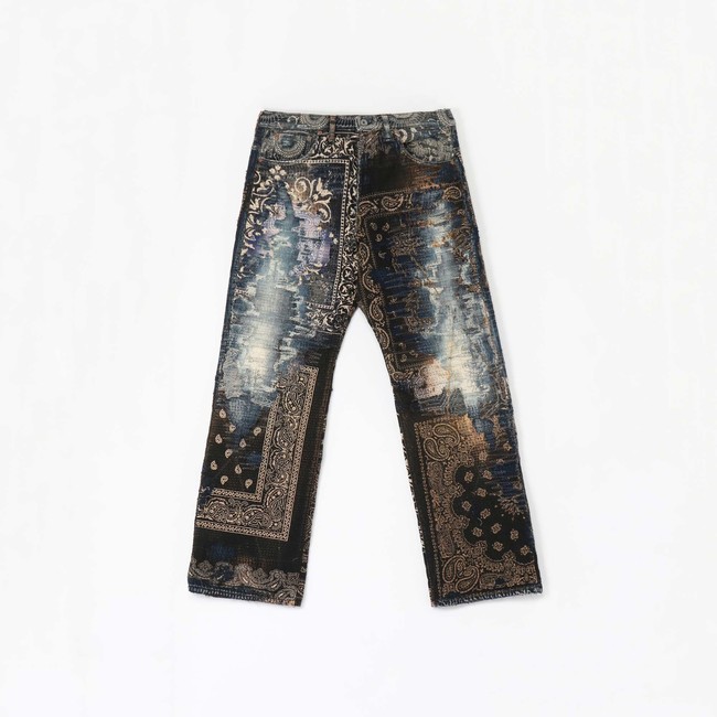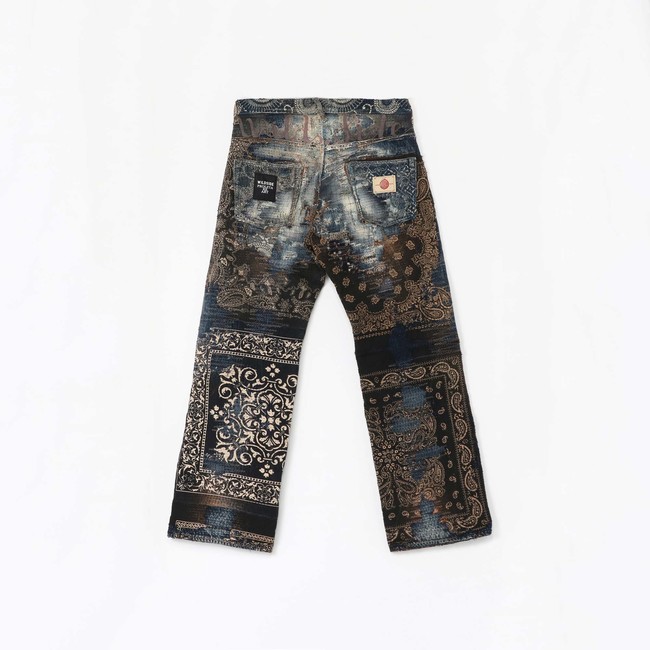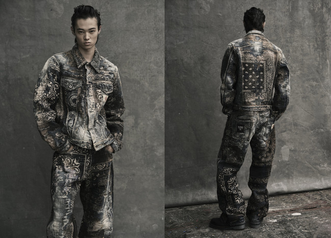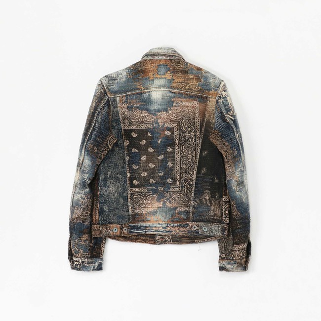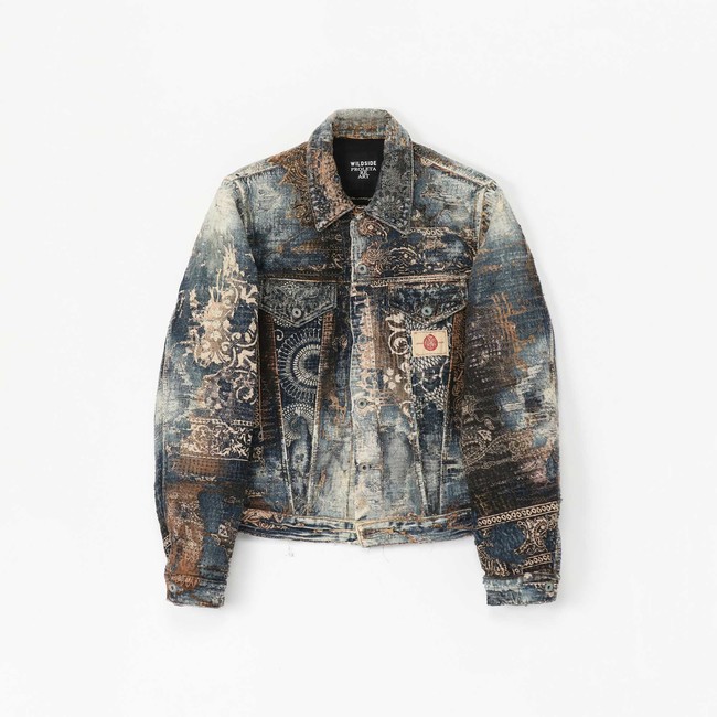 今回はボディにYohji Yamamoto POUR HOMMEのデニムジャケットとデニムパンツを使用し、MADE IN USAのヴィンテージバンダナや江戸~大正時代の“襤褸BOROの半纏”を解体し取り出した藍染の古布をパッチワーク素材に用いて、WILDSIDEの為に“BLACK”をテーマにカスタムしたスペシャルピースが登場。ブランドの象徴的なテーマである“UROBOROS”シリーズとしてアレンジした世界に一つのエクスクルーシブアイテムです。