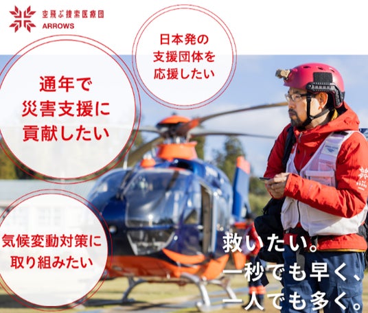 認定NPO法人ピースウィンズ・ジャパン(本部:広島県神石高原町 代表理事:大西健丞)が運営する医療を軸とした災害緊急支援プロジェクト「空飛ぶ捜索医療団“ARROWS”」(リーダー:医師・稲葉基高)は、企業・団体など法人向けの会員制度「コーポレートマンスリーサポーター」を新設しました。