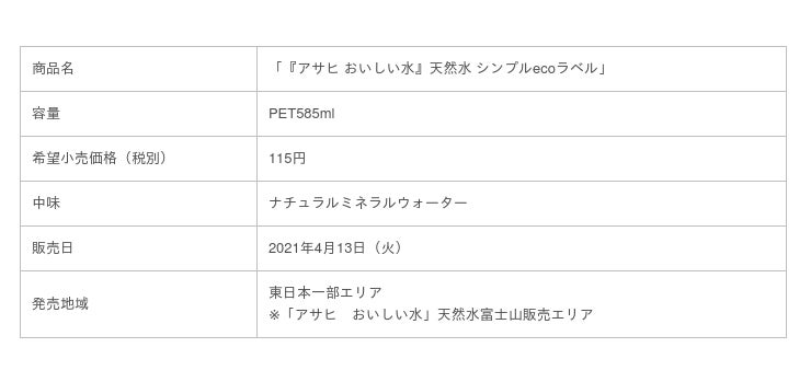 アサヒ飲料株式会社(本社 東京、社長 米女 太一)は、「『アサヒ おいしい水』天然水 シンプルecoラベル」PET585mlを2021年4月13日(火)より東日本の一部エリア限定で店頭と一部の自動販売機にてテスト販売を開始します。
