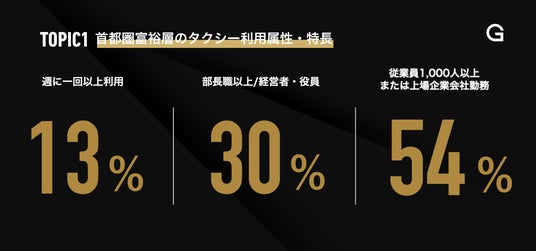 「タクシーを利用する」と回答した人は、回答者全体の55.6%を占め、週1回以上タクシーを利用する層も13%にのぼるなど、首都圏在住の富裕層の中に、タクシーを日常的な移動手段として活用する層が一定数存在することが確認できました。また、「タクシーを利用する」と回答した層には、部長職以上の会社員や経営者・役員が約30%、従業員1,000人以上または上場企業勤務者も54.2%であり、ビジネスシーンにおける意思決定層が多い点も特徴的です。