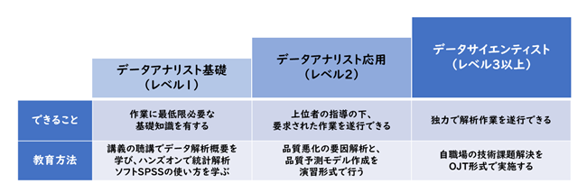 *当社生産技術系の教育体系では、レベル1相当の基礎編、レベル2相当の応用編までをデータアナリスト育成とし、レベル3からレベル6までをデータサイエンティスト育成教育とし、大きく3つの段階に分類しています。