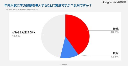 年内入試に学力試験が導入されることについて、「賛成」は40.9%、「反対」12.5%、「どちらとも言えない」は46.6%となりました。