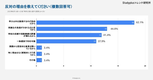 一方、「反対」と回答した人は「学力以外を重視するのが年内入試の目的だから」56.8%「受験生の負担が大きくなると思うから」51.6%「学校の成績や活動実績の評価が薄れるから」48.4%などを選択しました。自由記述では「就活早期化と同じことが起こる」などの回答もありました。
