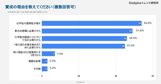 賛成の理由として「公平性や透明性が増すから」56.8%「努力の評価に必要だから」51.6%「入学後の勉強についていけるか心配だから」48.4%「一般入試との差を縮めるのに必要だから」47.4%が多く選択されました。