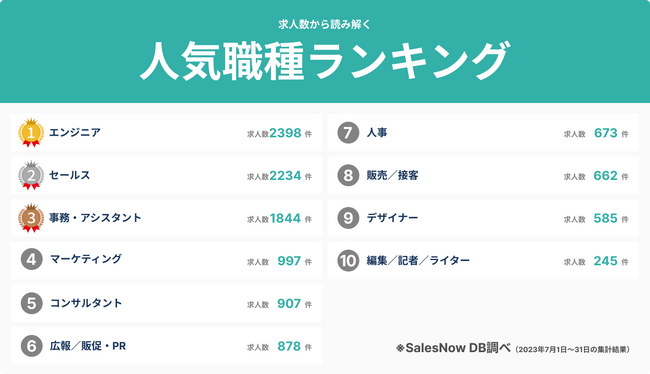 「データとテクノロジーで、働き方を変革する。」をミッションに掲げ、日本全国500万社以上の企業データを基盤に営業の効率化を支援する「SalesNow」を展開してきた株式会社SalesNow(本社:東京都渋谷区、代表取締役:村岡功規、以下「SalesNow」)は、日本全国500万社以上の企業情報を網羅した日本最大級のデータベースを誇る「SalesNow DB」において、2023年7月の「求人数から読み解く人気職種ランキング」をお知らせします。