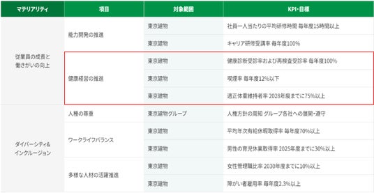東京建物グループは、事業を通じて「社会課題の解決」と「企業としての成長」をより高い次元で両立するため、ESG経営の高度化を推進し、グループ全体で積極的にサステナビリティ施策に取り組んでいます。健康経営の推進については、ESG経営における社会関連の目標の一つとして以下のとおり掲げています。2023年度より、役職員の自律的な健康管理意識の醸成をより一層促すべく、新たに「適正体重維持者率※42028年度までに75%以上」を目標としました。