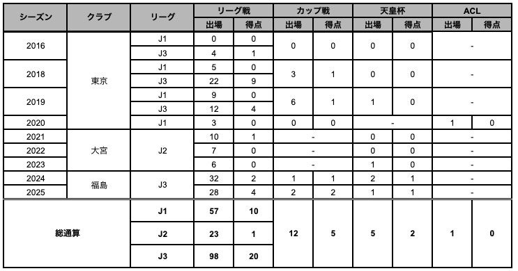 【サッカー歴】八王子 CBX FC→FC 東京 U-15 むさし→FC 東京 U-18→中央大→FC 東京→大宮アルディージャ→福島ユナイテッド FC