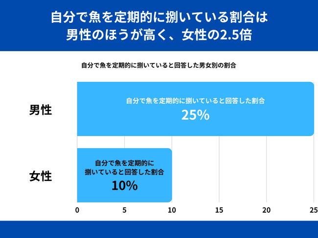 自分で魚を定期的に捌いていると回答した割合を男女別でみてみますと、男性が25%、女性が10%という結果になりました。