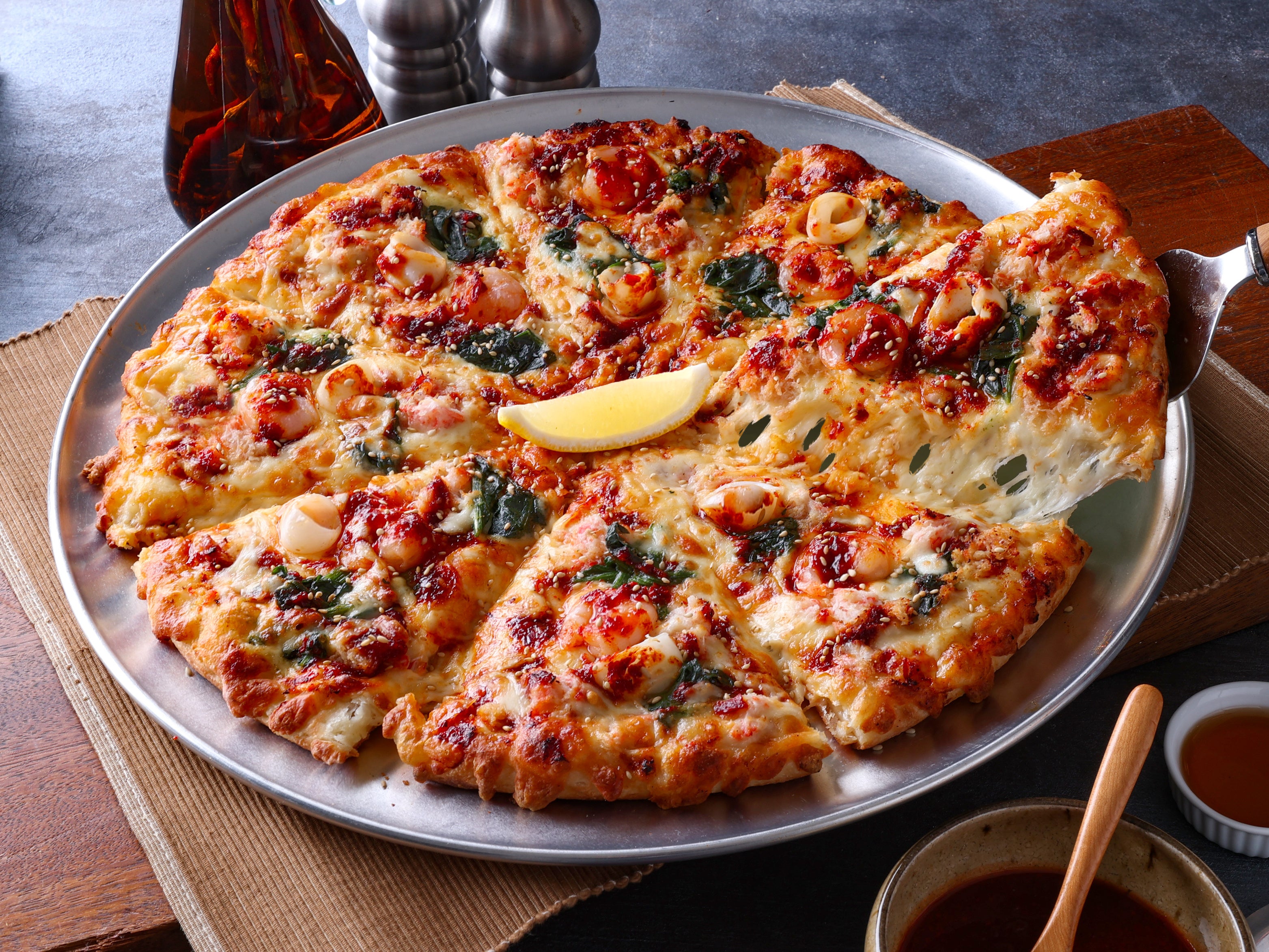 エビ・カニ・イカの“魚介ゴールデントリオ”に特製の甘辛ヤンニョムソースを合わせた贅沢なシーフードピザ。生搾りフレッシュレモンで、爽やかな味わいも楽しめます。