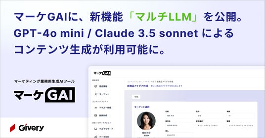 株式会社ギブリー(本社:東京都渋谷区、代表取締役社長:井手高志、以下当社)が運営するマーケティング業務用生成AIツール「マーケGAI(マーケジーエーアイ)」は、2024年9月13日より、任意の生成AIを選んで生成できる「マルチLLM」機能の提供を開始します。本機能の搭載によって、従来の「GPT-4o」に加えて「GPT-4o mini」、Anthropic社が提供するLLM(大規模言語モデル)「Claude 3.5 sonnet」をコンテンツ生成に利用することが可能となります。