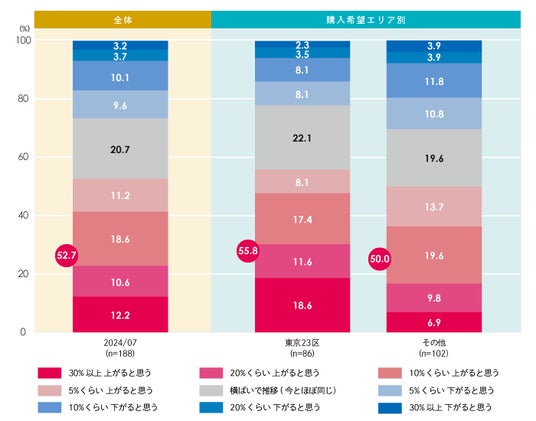 ≪ポイント≫全体の52.7%が今の価格からさらに上がると予測しており、30%以上あがるとの回答は、全体で12.2%、東京23区検討者では、18.6%