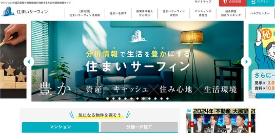 ・住まいサーフィン サイト概要マンションの適正価格や資産価値を判断するための価格情報サイト。2004年より会員制に移行し、マンションの売買をする時に知りたい情報を”見える化”、購入・売却検討者が知ることが難しかった不動産情報を提供し、持ち家取得を後押ししている。マンションの査定価格・相場情報と会員の物件評価・デベロッパー評価などの豊富なコンテンツを持つ。中古マンション販売データ約280万件、賃貸データ約1億件を保有し、会員数は31万人(2024年8月時点)を超える業界最大級の不動産ビッグデータカンパニーとして、不動産情報を調査・分析するスタイルアクト株式会社が運営している。