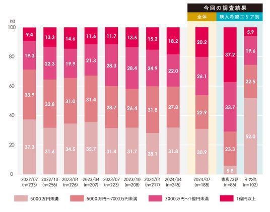 不動産経済研究所によると、2024年上半期の首都圏(東京都と神奈川、埼玉、千葉各県)の新築マンション1戸当たりの平均価格は、7,677万円となっており、また東京23区だけでみると、新築マンション1戸当たりの平均価格は1億円超となっています。実際に購入希望価格を見てみると、全体の46.3%が購入希望価格を7,000万円以上と回答、特に東京23区検討者では、7,000万円以上が70%を超え、1億円以上が37.2%となっています。