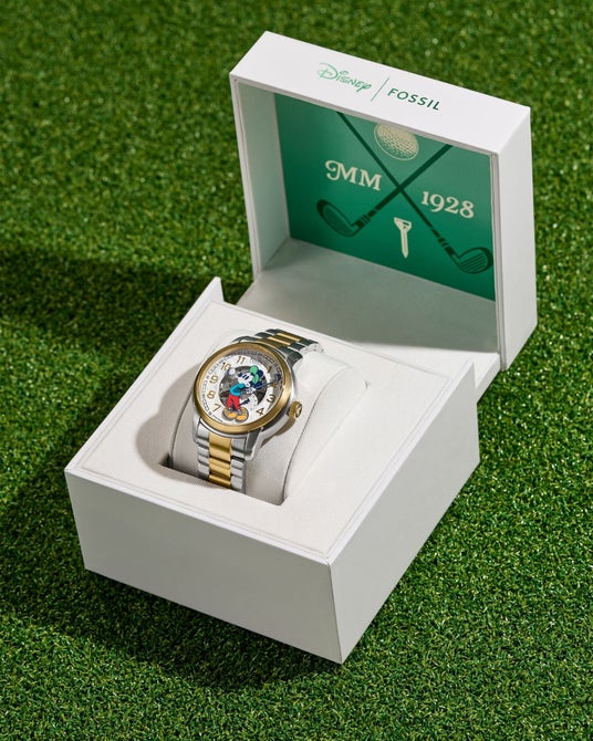 今回のアイテムは、フォッシルを象徴するHERITAGE AUTOMATIC(ヘリテージ オートマティック)のデザインに、ゴルフクラブを振るクラシックなミッキーマウスをプリント。飛んでいるゴルフボールが時針、スイングするゴルフクラブが分針に、そしてゴルフティーが秒針になっています。また自動巻きムーブメントが覗くスケルトンダイアルの周囲には、さりげないディンプル加工を施してゴルフボールの模様になっています。ケースバックには、ゴルフボールでミッキーマウスのシルエットをプリントし、細部にまでゴルフを楽しむミッキーマウスをデザインしています。