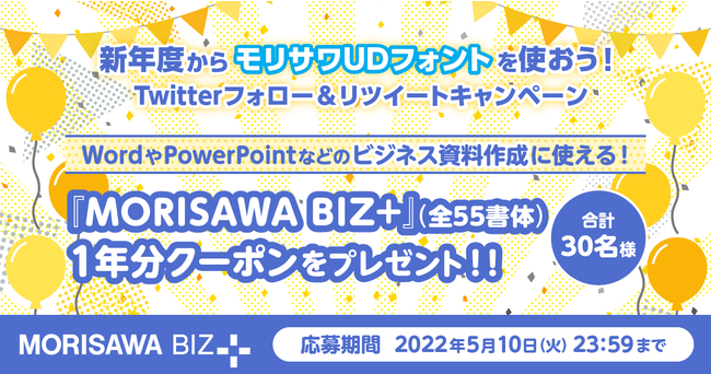 期間中、モリサワ公式Twitterをフォローし、対象のキャンペーンツイートをリツイートしていただいた方の中から抽選で30名様に、UDフォント全55書体を利用することができる「MORISAWA BIZ+(モリサワ ビズプラス)」の電子クーポン1年分(3,960円相当)をプレゼント。Word、PowerPoint、Excelでの資料作成などビジネスシーンに最適なUDフォントを、新年度からお使いいただけるチャンスです。皆さまのご応募をお待ちしています。