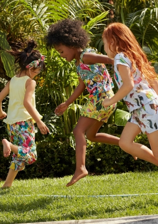 コレクションは、トップス、Tシャツ、パンツ、ドレス、ショートパンツ、オールインワン、スイムウェアなどを展開し、主にコットンジャージー、軽くてゆったりしたシフォン、プリントされたリバーシブルのスパンコールなどの素材で出来ています。シルエットは、キャップスリーブやフリル付きのネックライン、ハンカチーフ風の裾など、細部にまでこだわり、チャーミングでリラックスした雰囲気です。小物類にはサンダルや帽子、ヘアバンドなどが登場します。
