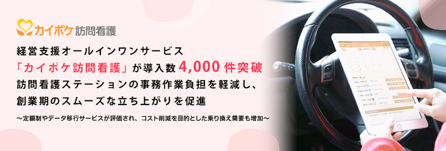 株式会社エス・エム・エス(本社:東京都港区、代表取締役社長:後藤夏樹、東証プライム、以下「当社」)は、提供する、訪問看護ステーション向け経営支援オールインワンサービス「カイポケ訪問看護」(URL:https://houkan.kaipoke.biz/)の導入数が6月1日時点で4,000件を突破したことをお知らせします。