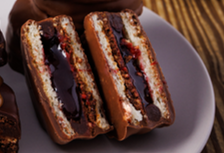 甘酸っぱいフランボワーズ風味のキャラメルと、マイルドな味わいのミルクチョコレートを挟んだ、ダックワーズサンドです。華やかな味わいで、アールグレイなどの紅茶やハーブティーとの相性も◎