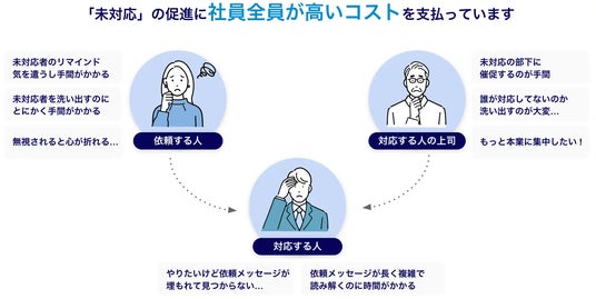 依頼をする社員は、毎日Slackやメールでの催促業務に大幅な時間を浪費し、かつ「対応してくれないストレス」に頭を悩ませています。