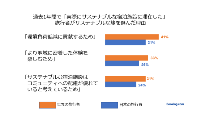 日本の旅行者の26%が「過去1年間にオンライン旅行サイトでサステナブルな宿泊施設を見たことがある」と回答し、28%は「宿泊施設が行っているサステナブルな取り組みに関する情報を予約前に積極的に確認している」と回答