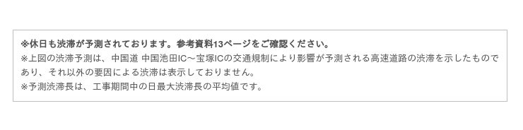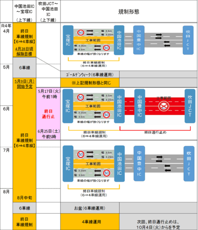 ※中国池田IC~宝塚IC間は車線幅が縮小され最高速度が50km/hとなりますので、速度や車間距離に注意して安全な走行をお願いします。なお、ゴールデンウィーク、お盆、年末年始の交通混雑期は一時的に6車線運用に戻りますが、車線幅の縮小並びに速度規制(最高速度50km/h)は継続します。