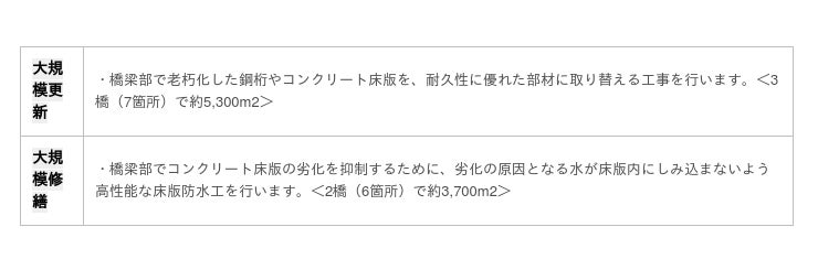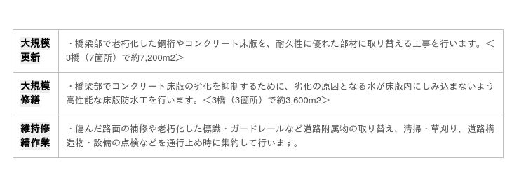 ◦リニューアル工事は、高速道路の安全性や耐久性を向上させ、より長く安心してご利用いただくために必要な工事です。今後、関西都市圏の高速道路においてリニューアル工事を進めてまいります。高速道路をご利用いただくお客さまや沿道の皆さまなどへの影響を最小限とするよう様々な取り組みを進めてまいりますので、何卒、ご理解とご協力をお願いいたします。