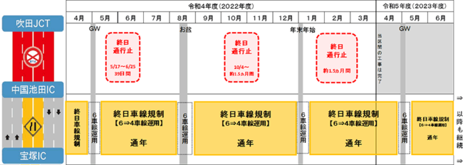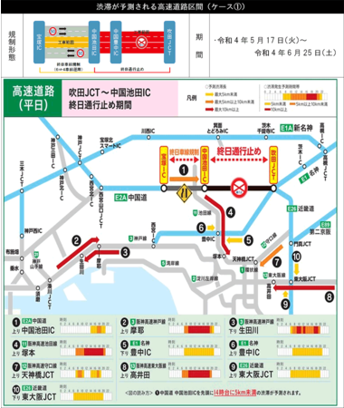 令和3年2月8日の「E2A 中国自動車道(吹田JCT~神戸JCT)でリニューアル工事を実施します」でお知らせしました令和4年度の工事の中国道リニューアル工事について、5~8月に実施予定の吹田JCT~宝塚インターチェンジ(IC)間の交通規制日程などの詳細が決まりましたのでお知らせします。