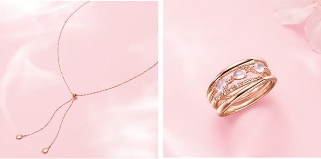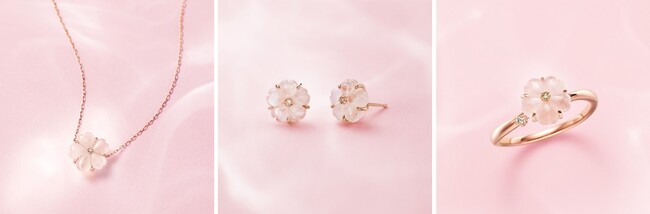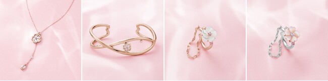 今年は、ぷっくりとした愛らしいオリジナルカットを施したローズクォーツやホワイトシェルをあしらうことで移ろいゆく桜の彩りを表現。美しく凛と咲く一輪の桜が程よい存在感を放つピアスや、春の風にホワイトやピンクの桜が可憐になびくネックレスやセットリングなど、桜がもつ様々な表情を捉えたジュエリーが登場します。先行予約特典として、桜の魅せる様々な表情に包まれる特別なスノードームのプレゼントもご用意。