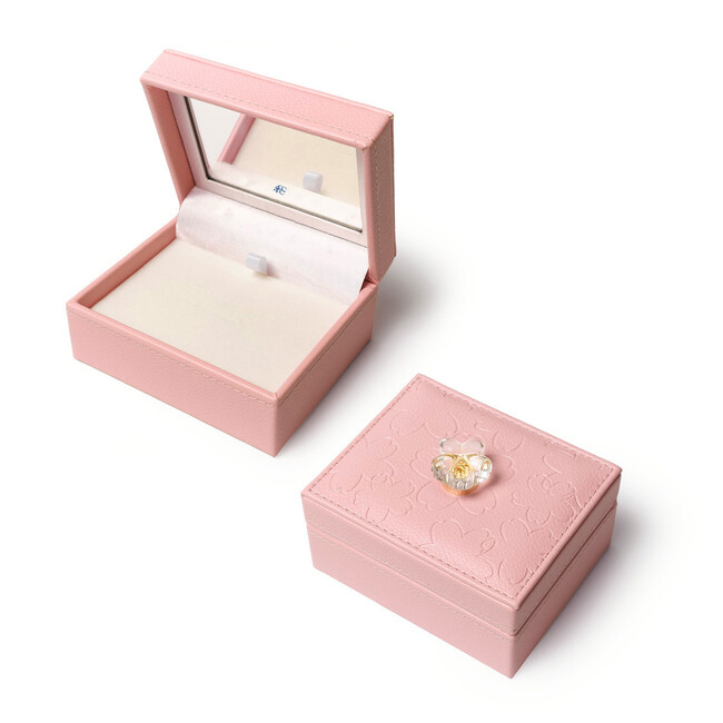 「2024 SAKURA Collection」のジュエリーは、オリジナル桜のシルエットの型押しを施したデザインが目を惹く限定ケースにお包みしてお渡しいたします。ケースのトップに咲く桜は、今年のコレクションならではのポイント。ピンクの桜に重なるぷっくりとした一輪の桜の花びらが魅力です。