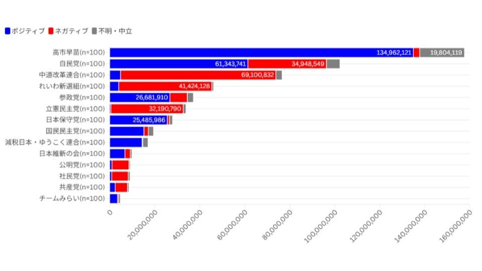 ・総視聴数は自民党・中道改革連合が2強、高市早苗氏個人の注目度も突出