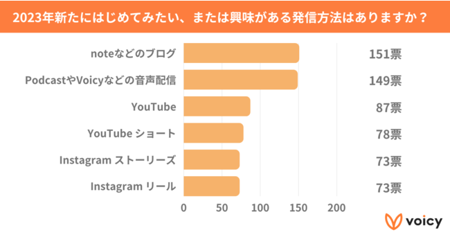 「2023年、新たにはじめてみたい、または興味がある発信方法はありますか?」(複数選択可)という質問に対し、「noteなどのブログ」が151票、「PodcastやVoicyなどの音声配信」が149票と、音声配信がブログに次いで2位という結果になりました。