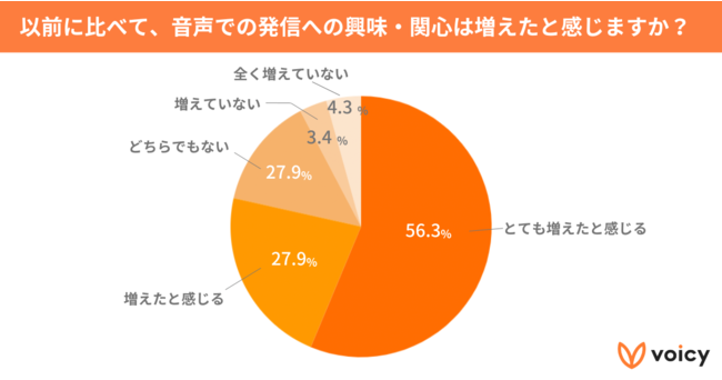 「以前に比べて、音声での発信への興味・関心は増えたと感じますか?」という質問に対し、「とても増えたと感じる」が56.3%、「増えたと感じる」が22.2%と、約8割の人が音声発信に関する興味が増えたと感じていることがわかりました。