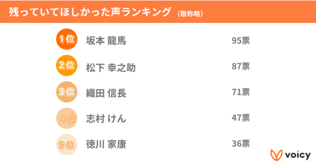 「歴史的の人物や偉業を成し遂げた方など、誰の声が残っていてほしかったと思いますか?」(複数回答可)という質問に対し、「坂本龍馬」が95票、次いで「松下幸之助」が87票、「織田信長」が71票という結果になりました。(敬称略)